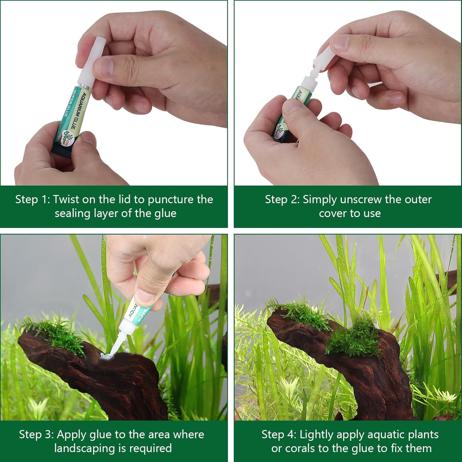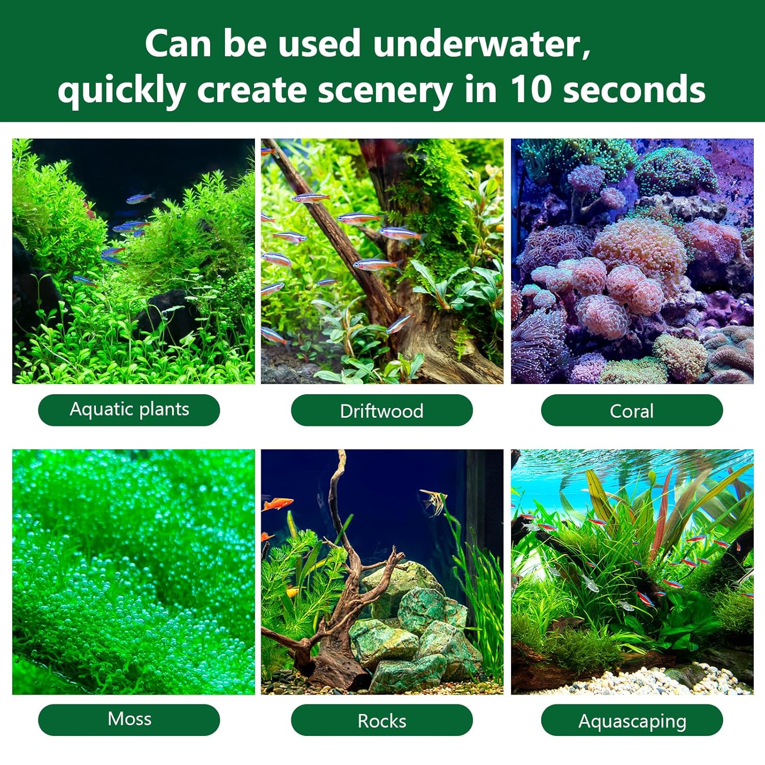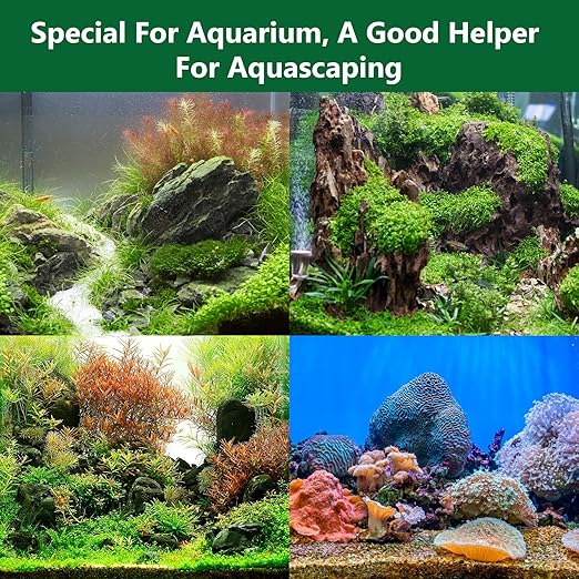 - [Widely Used] Our aquarium glue is perfect for a variety of materials, including live plants, corals, moss, reefs, shells, wood, stones, and artificial decorations. It’s the ideal choice for all your aquascaping needs