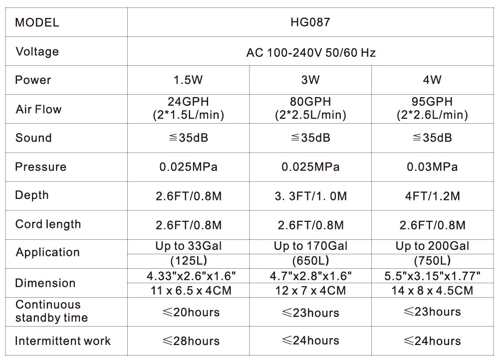 The HG087 AC air pump has a built-in rechargeable lithium battery, which provides up to 20+ hours of working time in normal mode and up to 25 hours of working time in intermittent mode.
