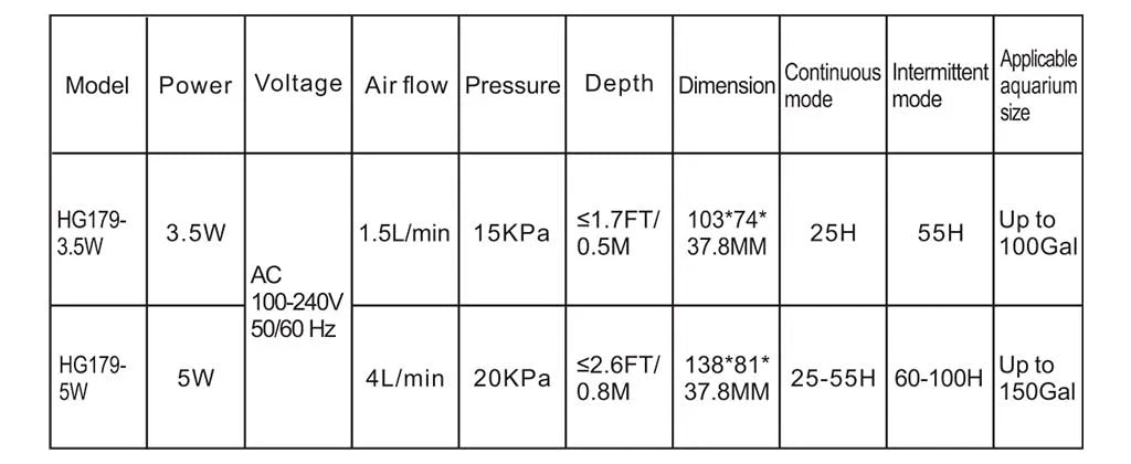 The hygger 179 compact air pump is built with a large-capacity battery, 2600mAh/5200mAh capacity. It designs two working models, the continuous mode provides a long 25 h-55 h working time, intermittent mode can last for 55 h-100 h. Easily recharge using the included USB magnetic charging cable with compatible phone chargers, power banks, or laptops.
