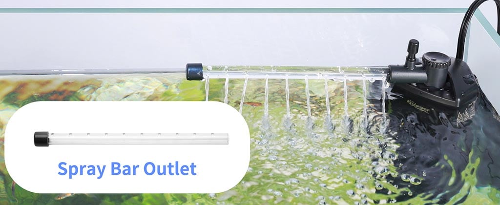 It has an adjustable & directional water flow output and a spray bar option that provides a uniform water flow evenly through filtration and works well as a powerhead for water circulation. The round spout arm has a connector where you can connect air tubing to aid aeration.
